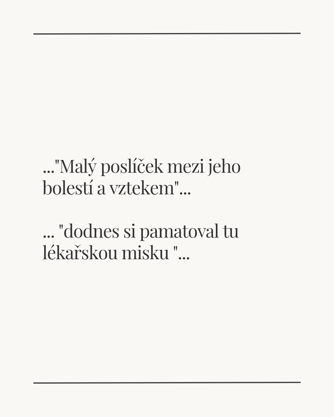 Neuvěřitelně daleko a přitom tak blízku byl ten okamžik co nechával jsem stranou. Je tu. Nestihl jsem Ti dát pusu na dobrou noc – ani na tu nejhlubší. Teď už mi na dopis neodpovíš. Dveře mi neotevřeš. Na telefon od Tebe bych čekal až do nejdelší smrti, a jen by mě pokryl prach.